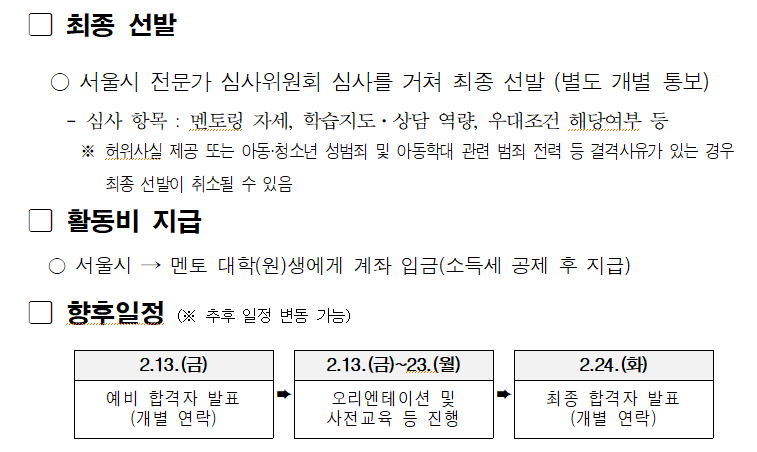 ※단, 허위사실 제공 또는 아동·청소년 성범죄 및 아동학대 관련 범죄 전력 등 결격사유가 있는 경우, 선발이 취소될 수 있음