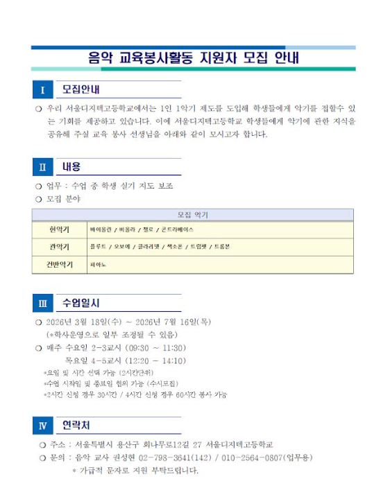 서울디지텍고등학교에서 음악교육봉사생을 모집하오니 관심있는 학생들의 지원 바랍니다.