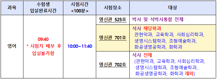 2026학년도 1학기 영어시험 장소 및 수험생 유의사항 안내