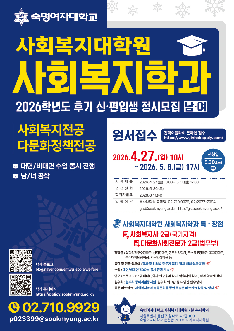 - 사회복지학과 사무실 / 02-710-9929 / E-mail : p023399@sookmyung.ac.kr