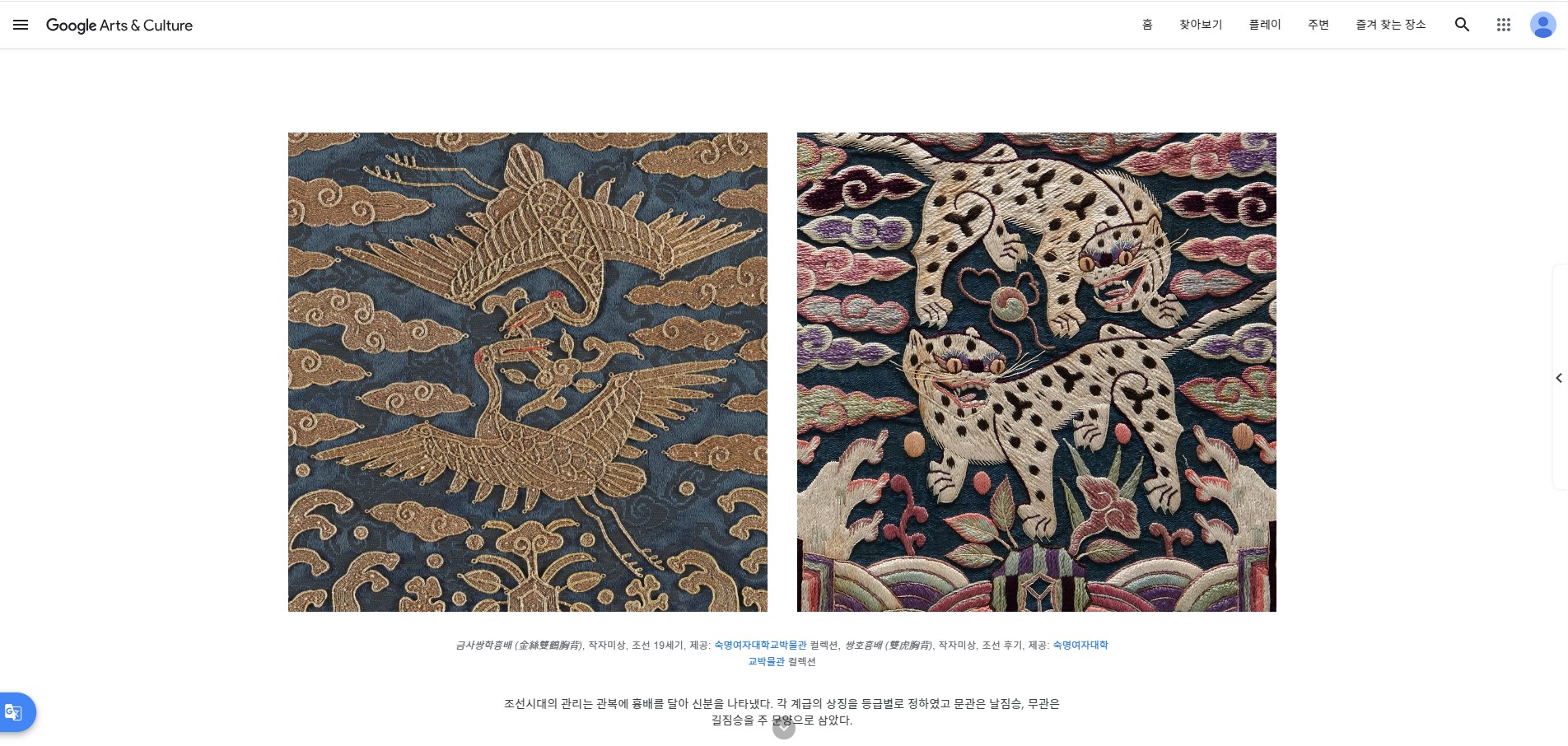 fnctId=bbs,fnctNo=1641 RSS 2.0 23 건 게시물 검색 제목 작성자 검색어 입력 공통(상단고정) 공지 게시글 게시글 리스트 [온라인전시]섬유의 시간:한국 근현대 자수 작성자 박물관 장소 구글 아트 앤 컬처 전시기간 조회 15 첨부파일 0 ★2025년 대학박물관 진흥지원 사업 특별전《섬유의 시간: 전통을 담고 미래를 잇다》Google Arts & Culture 온라인전시★전시명 : 섬유의 시간:한국 근현대 자수 전시기간 : 상시장소: 구글 아트 앤 컬처 홈페이지와 모바일앱협력: 구글 아트 앤 컬처 숙명여자대학교박물관의 온라인 전시회를 구글 아트 앤 컬처 플랫폼을 통해 선보입니다. 아래 사진을 클릭하시면 온라인 전시 <섬유의 시간:한국 근현대 자수>를 감상할 수 있습니다. 주최 | 문화체육관광부주관 | 한국대박물관협회운영 | 숙명여자대학교박물관 [온라인전시]섬유의 시간:한국 전통 자수 작성자 박물관 장소 구글 아트 앤 컬처 전시기간 조회 18 첨부파일 0 ★2025년 대학박물관 진흥지원 사업 특별전《섬유의 시간: 전통을 담고 미래를 잇다》Google Arts & Culture 온라인전시★전시명 : 섬유의 시간:한국 전통 자수 전시기간 : 상시장소: 구글 아트 앤 컬처 홈페이지와 모바일앱협력: 구글 아트 앤 컬처 숙명여자대학교박물관의 온라인 전시회를 구글 아트 앤 컬처 플랫폼을 통해 선보입니다. 아래 사진을 클릭하시면 온라인 전시 <섬유의 시간:한국 전통 자수>를 감상할 수 있습니다. 주최 | 문화체육관광부주관 | 한국대박물관협회운영 | 숙명여자대학교박물관 [온라인전시]흥완군 복식의 여정 작성자 박물관 장소 구글 아트 앤 컬처 전시기간 조회 10 첨부파일 0 전시명 : 흥완군 복식의 여정전시기간 : 상시장소: 구글 아트 앤 컬처 홈페이지와 모바일앱협력: 구글 아트 앤 컬처 숙명여자대학교박물관의 온라인 전시회를 구글 아트 앤 컬처 플랫폼을 통해 선보입니다. 아래 사진을 클릭하시면 온라인 전시 <흥완군 복식의 여정>을 감상할 수 있습니다. [360°VR전시]섬유의 시간: 전통을 담고 미래를 잇다 작성자 박물관 장소 홈페이지, 유튜브 전시기간 조회 60 첨부파일 0 2025년 대학박물관 진흥지원 사업 특별전《섬유의 시간: 전통을 담고 미래를 잇다》360° VR360° VR 영상을 통해 《섬유의 시간: 전통을 담고 미래를 잇다》 전시를 어디서든 관람할 수 있습니다. 스마트폰에서는 손가락이나 핸드폰을 움직여 전시장을 이동할 수 있습니다. pc에서는 마우스로 화면을 움직여 전시를 자세히 살펴볼 수 있습니다.사진을 누르시면 [정영양자수박물관]Ⅰ.섬유예술의 역사를 기록하다 VR전시를 볼 수 있습니다. 사진을 누르시면 [숙명여자대학교박물관]Ⅱ.섬유예술의 미의식을 잇다 VR전시를 볼 수 있습니다. 사진을 누르시면 [문신미술관]Ⅲ.업사이클링으로 미래를 만들다 VR영상을 볼 수 있습니다. 주최 | 문화체육관광부주관 | 한국대박물관협회운영 | 숙명여자대학교박물관 [온라인전시]섬유의 시간: 전통을 담고 미래를 잇다 작성자 박물관 장소 홈페이지, 유튜브 전시기간 조회 83 첨부파일 0 ★2025년 대학박물관 진흥지원 사업 특별전《섬유의 시간: 전통을 담고 미래를 잇다》★2025년 대학박물관 진흥지원 사업 특별전 《섬유의 시간: 전통을 담고 미래를 잇다》는 전통을 기록하고 미의식을 계승하여 미래로 이어가는 섬유공예의 여정을 살펴보는 전시입니다. 고대부터 근대까지 동아시아의 중요한 섬유 유물과 섬유예술 작품을 통해 섬유라는 주제를 총 3부로 조명합니다. 정영양자수박물관, 숙명여대박물관, 문신미술관으로 이어지는 전시를 통해 섬유의 역사와 미래의 흐름을 보여주는 유물과 작품을 만나볼 수 있습니다! [정영양자수박물관]Ⅰ.섬유예술의 역사를 기록하다 1부 섬유예술의 역사를 기록하다는 기원전부터 근대 이전까지의 동아시아 섬유예술을 소개합니다. 2,000여년 전 청동거울에 부착된 자수 장식, 중국 한 대 마왕퇴 출토 섬유 재현품, 요·원·명 시대의 복식과 섬유 장식을 통해 동아시아 섬유예술의 역사를 살펴볼 수 있습니다. *협력기관: 유금와당박물관 *사진을 누르시면 Ⅰ.섬유예술의 역사를 기록하다 온라인 전시를 볼 수 있습니다. [숙명여자대학교박물관]Ⅱ.섬유예술의 미의식을 잇다 2부 ‘섬유예술의 미의식을 잇다’는 박물관이 소장하고 있는 유물을 통해 섬유예술의 아름다움과 가치를 살펴보고 이를 계승하고 있는 근현대 자수 작품을 전시하여 현대의 기술과 미의식으로 이어가는 섬유공예의 현재를 조명해 봅니다. *사진을 누르시면 Ⅱ.섬유예술의 미의식을 잇다 온라인 전시를 볼 수 있습니다. [문신미술관]Ⅲ.업사이클링으로 미래를 만들다 3부 ‘업사이클링으로 미래를 만들다’는 폐자원에 디자인을 더하거나 활용 방법을 바꿔 새로운 가치를 창출하는 업사이클링(Upcycling)을 주제로 준비했습니다. 현대 섬유공예가 금기숙·김태연·김지용 작가의 작품, 한국국제교류재단의 협력으로 김인규·차동훈의 미디어아트 작품, ‘서울새활용플라자’에서 제공한 재료로 제작된 작품 등이 전시됩니다. *사진을 누르시면 Ⅲ.업사이클링으로 미래를 만들다 온라인 전시를 볼 수 있습니다. 주최 | 문화체육관광부주관 | 한